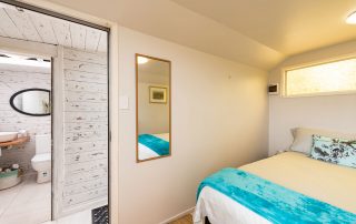 The detached cabin sits on a slightly lower level adjacent to the single car parking area, 10 metres distant but a 20 metre walk. It has a toilet and washbasin, and Wifi availability. If staying with young children, the pullout couch in the Apartment may be a better option for sleeping. The Apartment has full Gib soundproofing, but please note there can be muffled noise transference when there are heavy footsteps above.